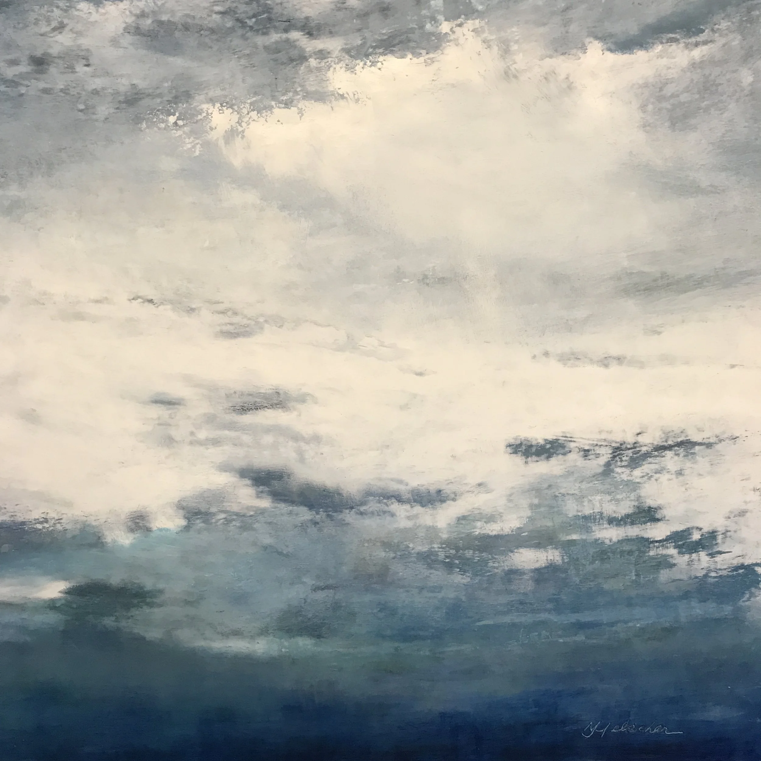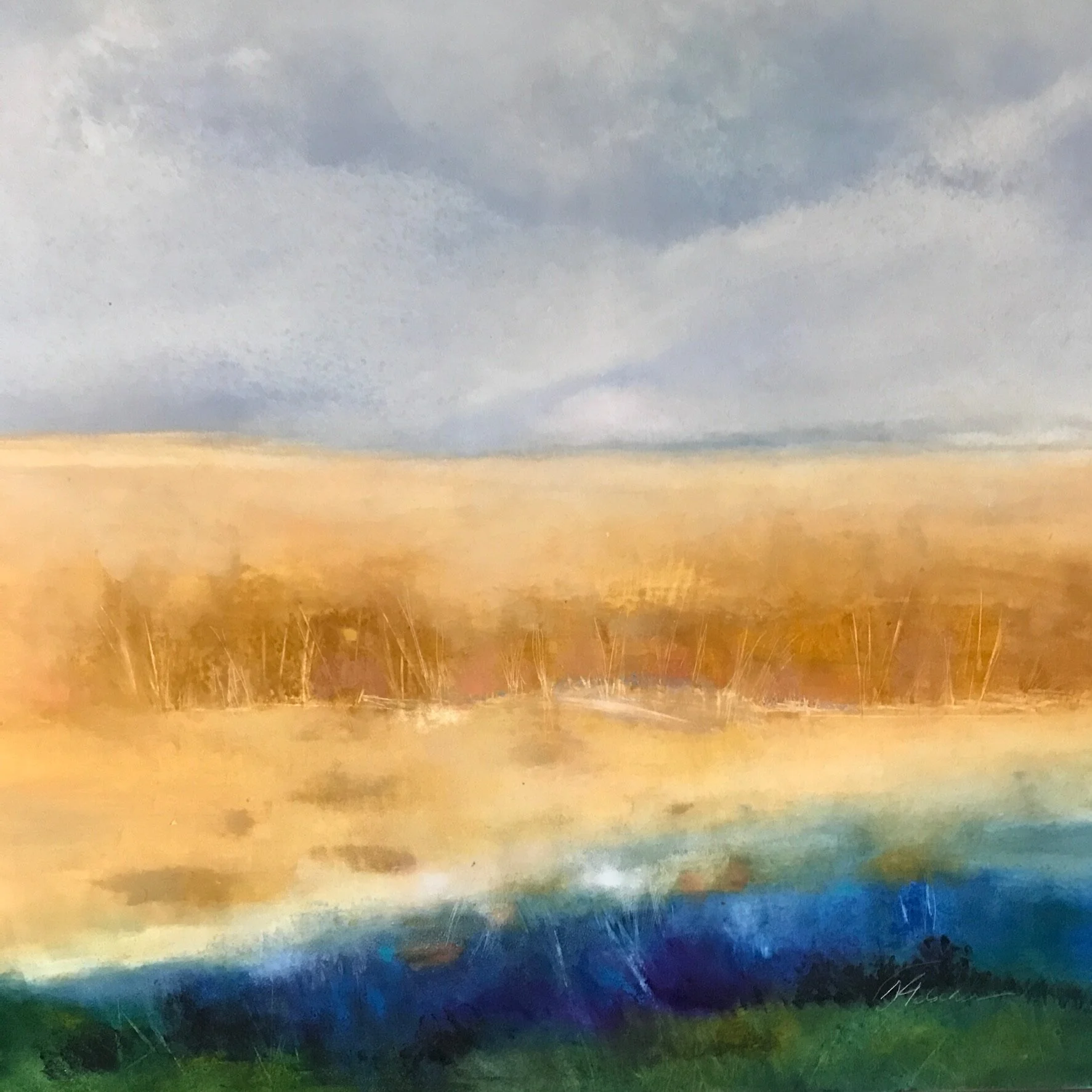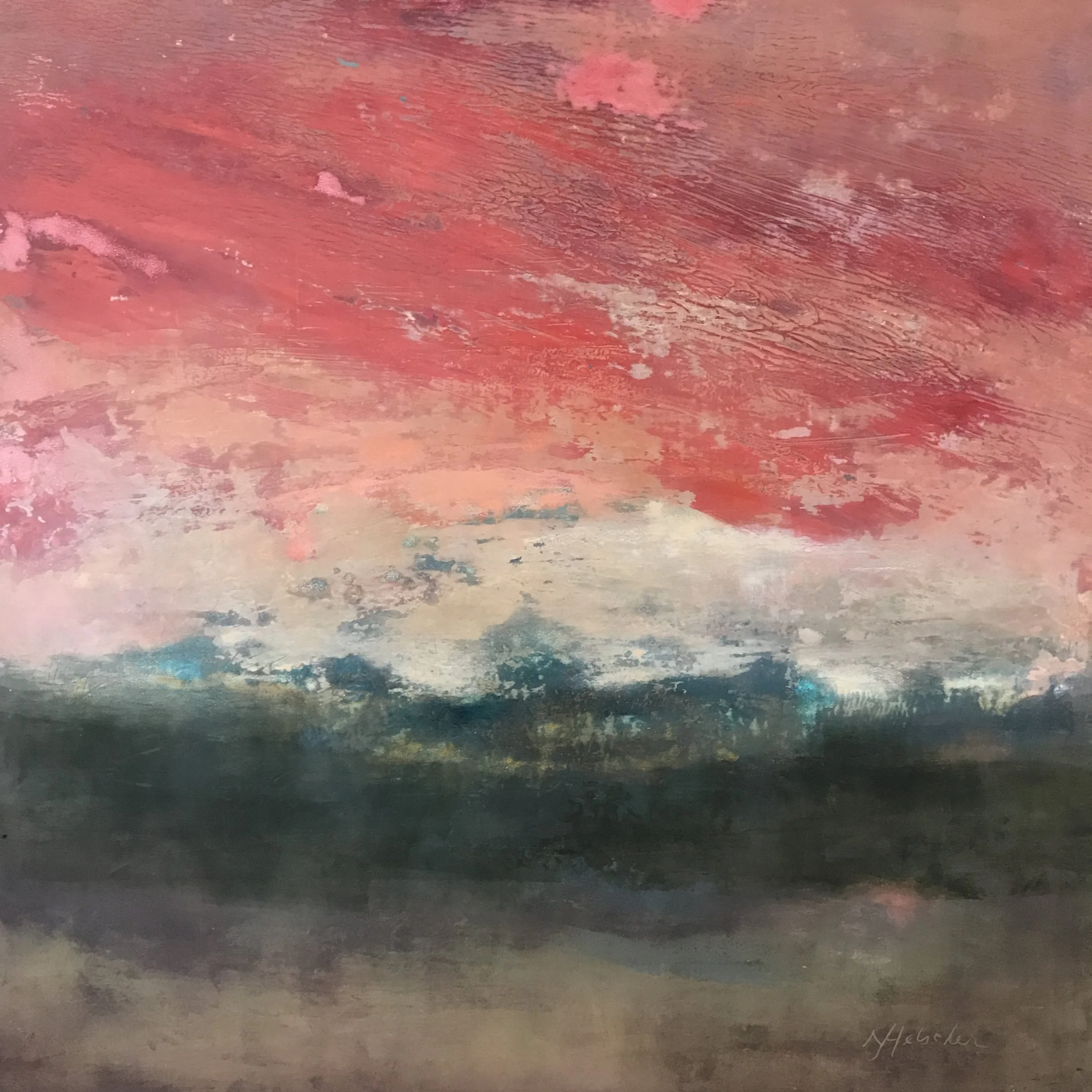 I enjoy manipulating surfaces. Blending my oils with different mediums gives me opportunities to achieve textural interest without looking rough. Cold wax extends the oils and allows for layers of color to build up subtlety. I do not use brushes, but enjoy brayers, spatulas, palette knives- anything that “moves” the mixture around on the gessoed boards.