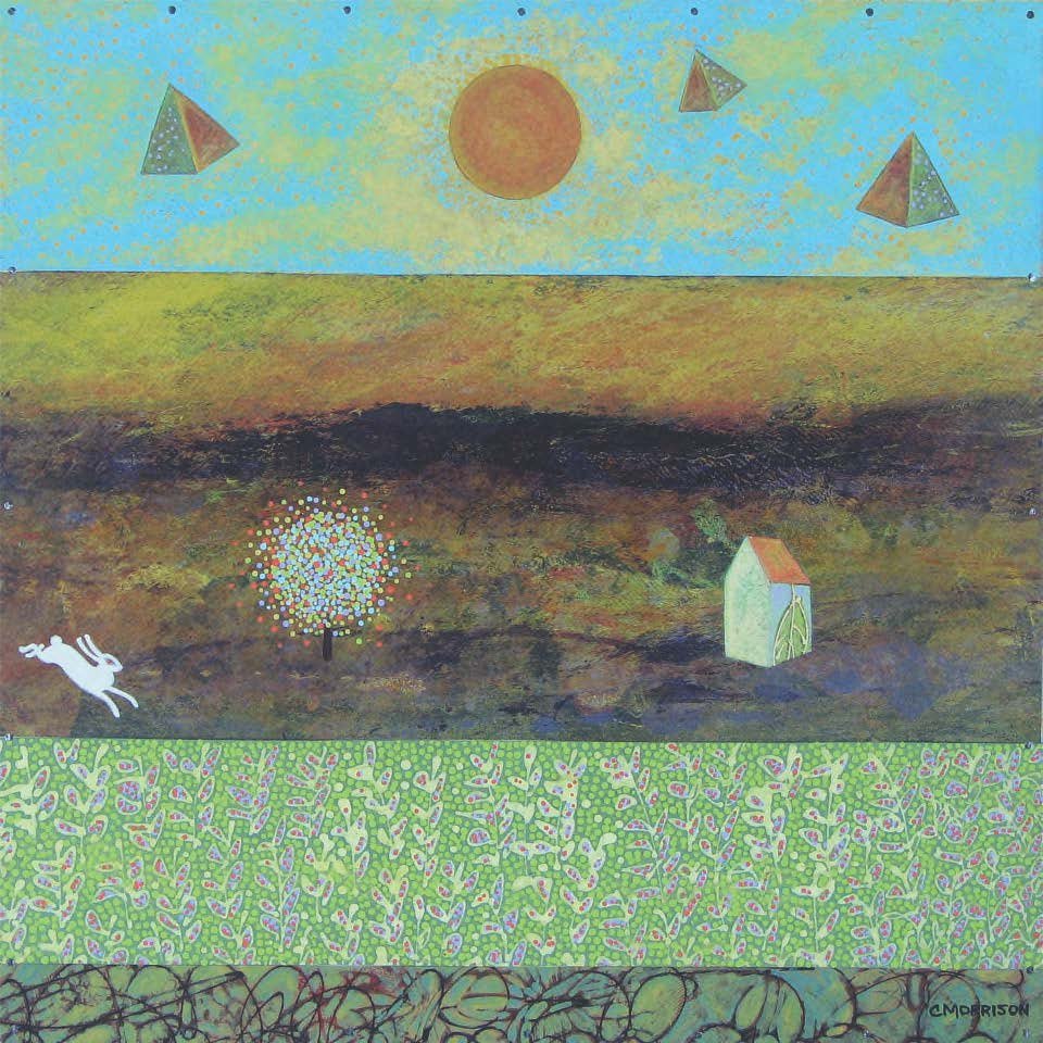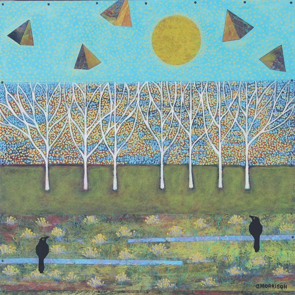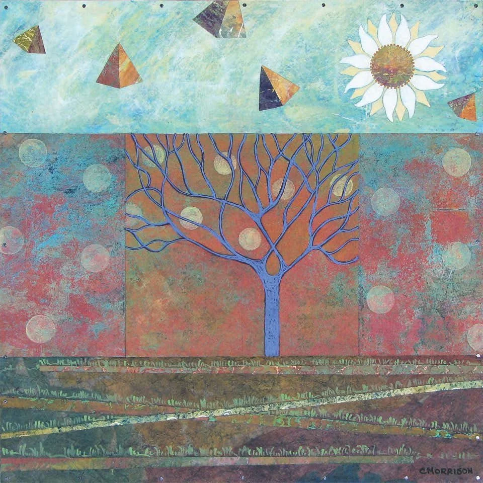 My work is combination of painting and collage. I piece together separate parts – various papers that I paint, cut into shapes and adhere to gessoed birch panel with gel medium and small nails. I add more cut paper pieces and painting to that surface and seal each piece with satin varnish for protection. I intend for each piece to have a graphic power from a distance and an engaging, delicate quality up close. My influences include folk art traditions from textiles and quilts to Mexican Retablos.