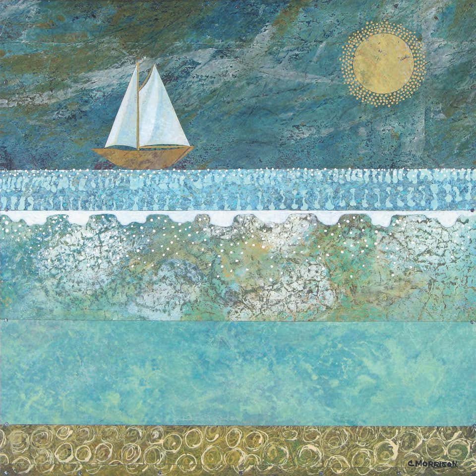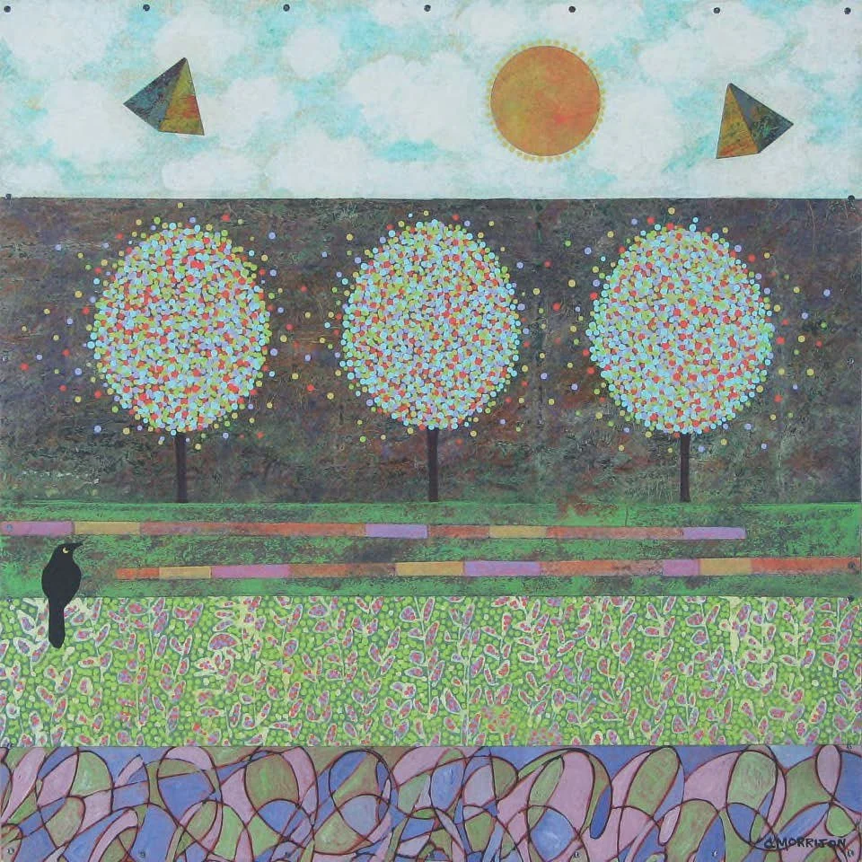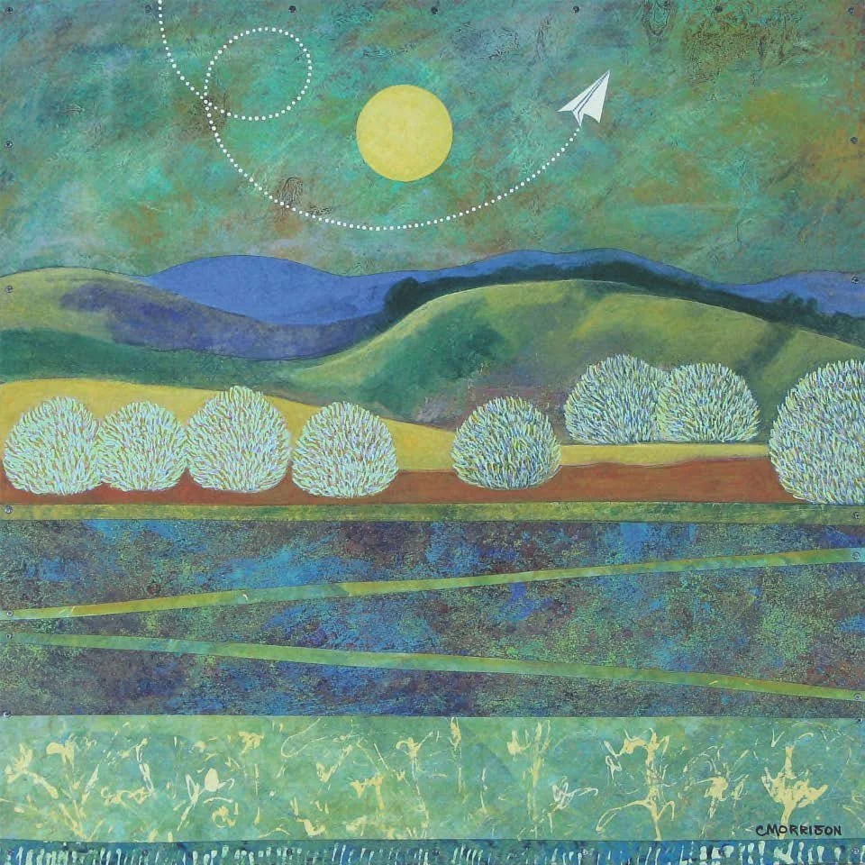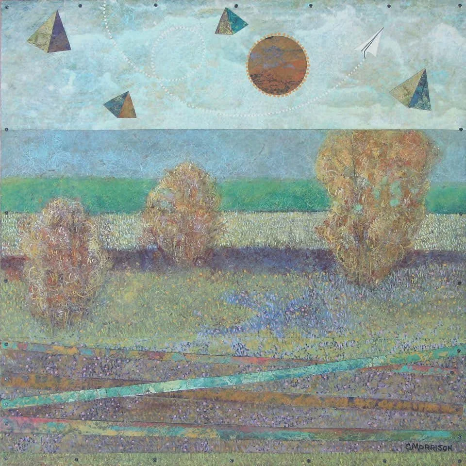 My work is combination of painting and collage. I piece together separate parts – various papers that I paint, cut into shapes and adhere to gessoed birch panel with gel medium and small nails. I add more cut paper pieces and painting to that surface and seal each piece with satin varnish for protection. I intend for each piece to have a graphic power from a distance and an engaging, delicate quality up close. My influences include folk art traditions from textiles and quilts to Mexican Retablos.